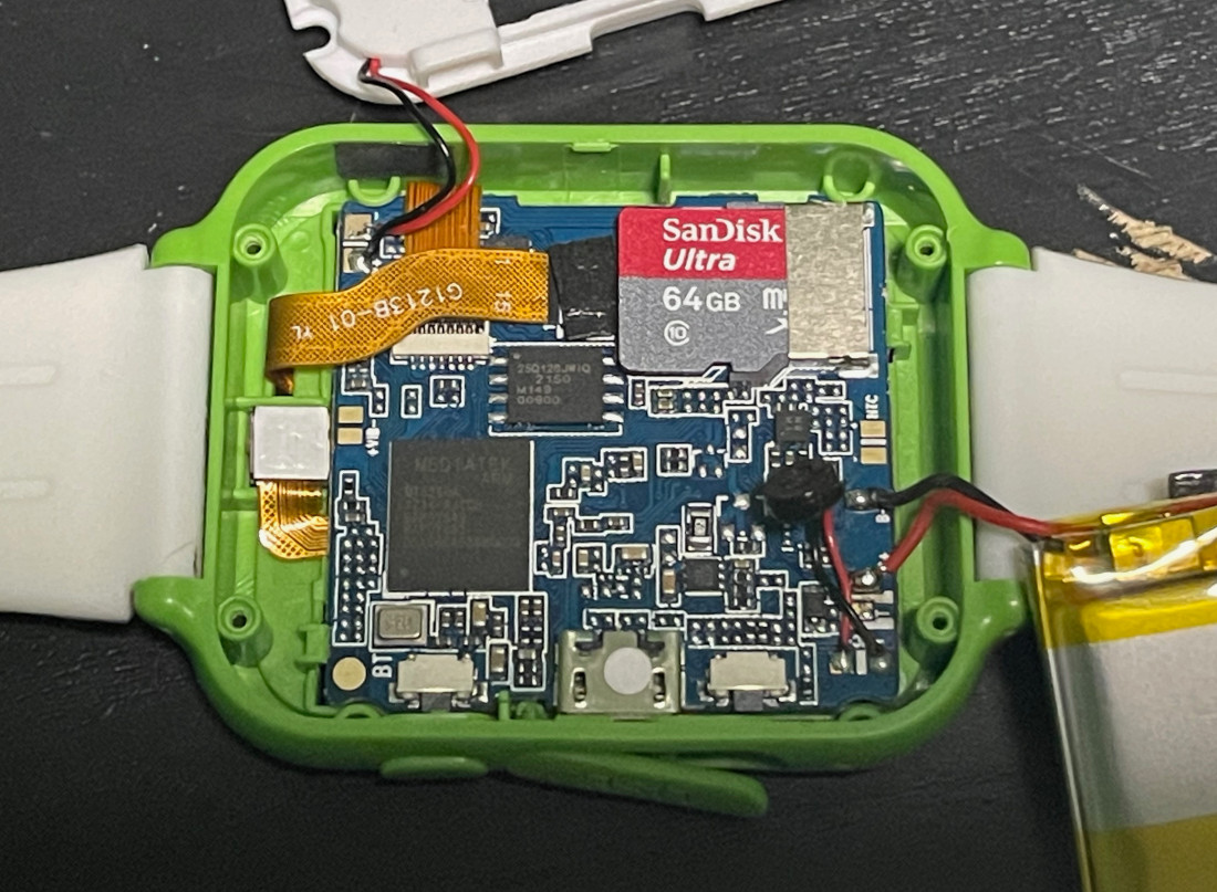 Taking the device apart (and removing the battery) reveals the internals. It's of no surprise that the internals are found in other watches at this price-point, though it does look somewhat odd in this packaging as the built-in SD-card reader isn't usable without opening the device.
